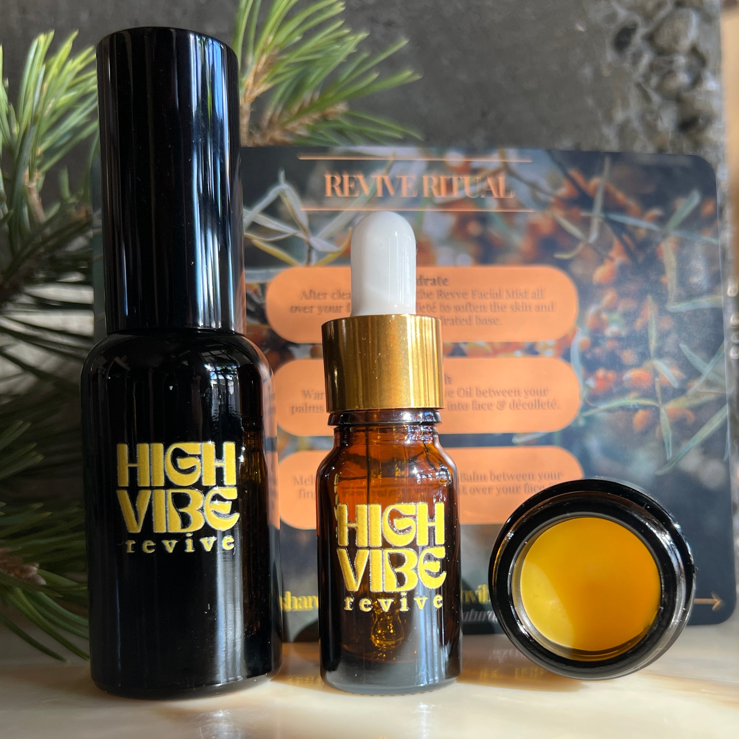 Revive brightens dull or tired skin and supports elasticity. It nourishes deeply with saffron, sea buckthorn, frankincense resin, and antioxidant rich oils for a soft, radiant glow.